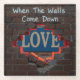 This design captures a powerful metaphor for revealing a hidden truth. It features a weathered brick wall with a jagged opening, through which the word "LOVE" is partially visible and glowing with a warm, red light. The phrase "When The Walls Come Down" is written in a light graffiti style on the brick, symbolizing the moment we choose to reveal what has been hidden.
