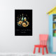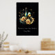 This sophisticated poster showcases an enchanting composition against a deep black background. At its centre stands an elegant bottle of wine with a shimmering turquoise-to-gold gradient, accompanied by a crystal glass filled with golden wine. The arrangement is adorned with luxurious roses in contrasting black and gold, surrounded by delicate gold leaves and decorative filigree elements. Golden stars and sparkling accents create a magical, celestial ambiance throughout the design. Artistic splashes of teal and gold add dynamic movement to the base of the composition. The elegant script at the bottom reads "Elegance in Every Sip. Beauty in Every Bloom," perfectly capturing the poster's marriage of fine wine appreciation and floral beauty. The overall aesthetic combines luxury, romance, and cosmic elements in a stunning visual celebration.