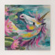 A modern abstract painting featuring a whimsical unicorn surrounded by pastel-coloured cacti and succulents. The unicorn, painted in flowing lines and vibrant colours, stands out against the soft tones of blush pinks, mint greens, and pale blues in the desert plants. This playful, imaginative composition combines the mystical aura of the unicorn with the organic beauty of desert flora, creating a dreamy, magical scene with a contemporary artistic touch.