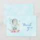 A small-sized thank you card with a charming illustration of a baby bunny riding along in a hot-air balloon decorated with hearts, a ribbon, flowers and butterflies.