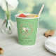 Whimsical baby shower themed paper cups features cute bee and flower wreath with customizable text on green background.