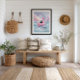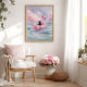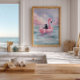 Add a dreamy, playful touch to your space with this whimsical watercolor artwork featuring a black cat floating on a pastel inflatable flamingo in gentle ocean waves. Soft pinks and blues, delicate brushstrokes, and serene seaside details create a lighthearted, imaginative coastal vibe.