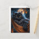 This magnificent black cat with orange eyes is taking a nap in a hammock under an autumn tree. The moon is shining bright in the starry sky behind him. Is it Halloween night? Probably! This postcard artwork is full of fantasy and whimsy.
