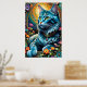 A quirky blue cat surrounded by vibrant flowers in a whimsical and colourful painting.