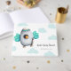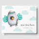 Cute baby shower guest book with a little bird in its spaceship going through the blue baby clouds. Personalized the text with your own information. Illustrated and designed by Patricia Alvarez.