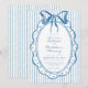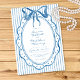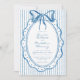 This whimsical invitation features a soft blue watercolor bow and a playful scalloped oval dotted frame against a classic blue and white striped background. Perfect for a wedding with a preppy or coastal aesthetic, this charming design provides a sweet, hand-painted look for your special celebration. Created by Simply Farmhouse Press.
