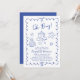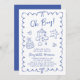On trend baby boy shower invitation featuring a french blue wavy frame adorned with bows, whimsical hand-drawn illustrations of hearts, stars, cake and nursery decor, and "Oh Boy!" and the name of the mother-to-be showcased in a fun, playful blue script.