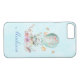 A phone case with a charming illustration of a little bunny riding along in a hot-air balloon decorated with a fancy pink ribbon, along with some flowers and butterflies. A pastel blue watercolor background gives it a vintage dreamy feel.