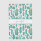 A chic white background decorated with a whimsical pattern of painted cactus, cacti and succulents and red and green hearts.