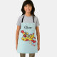 This personalized kids' apron features a cute, smiling, cartoon fireplane with a red firefighter's helmet, in vibrant yellow and red, soars through the sky, spraying a magical trail of colourful hearts and stars.