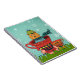 A spiral notebook with an image of an adorable orange cat sitting in a teacup. Wearing a winter hat and scarf. Snowflakes falling against a light green background.