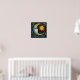 The image is a square canvas print with a black background. In the centre of the canvas, there is a crescent moon with a face of a sun on the left side. The sun is facing towards the right side of the image, with its eyes open and its mouth slightly open. The background is filled with swirls and patterns in various shades of blue, green, and orange. There are also small orange and yellow stars scattered throughout the image. The overall style of the print is whimsical and dreamlike.