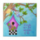 Protect your table or countertop when you use this delightful Whimsical Chequerboard Birdhouse. Whimsical Chequerboard Birdhouse is a charming and colourful illustration created by Debi Payne Designs. This illustration features a whimsical birdhouse of purple and teal accented with multiple doodle flowers sitting above a black and white chequerboard border base. The birdhouse is hanging in a tree with multiple green leaves by a delicate bow tie purple ribbon. Perched on a tree limb and flying in the air are two little Tweedie birds. Accenting the illustration is the hand-lettering positive saying that reads, “Friends are the sunshine of life.” The illustration and text are all over a sky-blue watercolor wash background.
