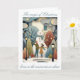 Whimsical cut paper Christmas card of young lovers building a snowman in a snowy city park.