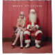 The image features a whimsical Santa Claus and Mrs. Claus sitting together on a wooden bench. Santa wears a traditional red suit with white fur trim, a classic red hat, and glasses. Mrs. Claus has a modern, stylish look with long blonde hair, a patterned red-and-white coat, white tights, pink knee-high socks, and red Mary Jane shoes. She also wears large round sunglasses, adding a playful twist to the holiday theme. The background is a deep red wallpaper with subtle festive patterns, creating a bold and stylish holiday atmosphere.