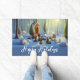 Fun Holiday front doormat features whimsical and surreal Christmas forest scene with snow capped trees, created with AI generating software. "Happy Holidays" text on blue background is customizable.