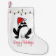 Whimsical Christmas stocking features black and white frog illustration with red Santa hat, a string of holiday lights and customizable "Happy Holidays" text