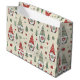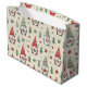 This charming Christmas gift bag features a delightful seamless pattern of festive gnomes holding hearts and presents, surrounded by stars, trees, and holiday icons. The Scandinavian-inspired design creates a cozy, heartwarming look perfect for Christmas gifting. An adorable choice for kids and adults alike.