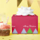 A pretty design featuring whimsical blue and green Christmas trees on a red background. The words 'Merry Christmas' can be changed as desired!