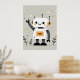 Amidst a whimsical backdrop, a friendly robot waves cheerfully, its white body and head adorned with orange circular ears and expressive black eyes. The playful style, scattered stars, and small plants create a delightful scene that appeals to both children and adults, adding a touch of futuristic charm and warmth to any nursery.