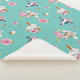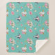 Whimsical Sherpa blanket features fun watercolor pattern of cow heads and clover flowers illustrations on light turquoise background.