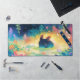 Brighten your desk with this vibrant and whimsical illustration of a dark blue axolotl resting peacefully on a lily pad. The adorable creature features contrasting orange-red gills and tail fins, adding a pop of warmth against the cool aquatic blues. The surrounding scene is a fantastical rainbow forest pond, where lush foliage in shades of deep purple, blue, and emerald green cascades from above. The foreground is adorned with large, brightly colored lotus flowers in brilliant hues of pink, orange, and white, all set against sparkling, sunlit water. This dreamy design creates a magical, nature-inspired focal point for any workspace. This desk mat offers versatile use for various other businesses, events, or situations.
