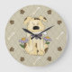 Cute dog theme wall clock done in a khaki coloured diamond pattern background. Graphics of a cartoon puppy dog, in the centre, with a bone in his mouth. The numbers on the clock are done in brown paw prints and bones. Customize to add any text you want. Makes a great gift idea.