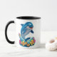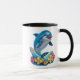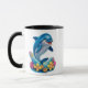 This 3D render presents a charming white ceramic coffee mug, featuring a playful dolphin joyfully splashing out of the water. The dolphin is surrounded by vibrant, colourful flowers in lively shades of pink, yellow, and orange, adding to the whimsical and cheerful atmosphere of the design. Perfect for coffee lovers who enjoy a fun, lively touch to their morning routine, this mug exudes positivity and brings a smile to any day.