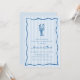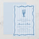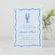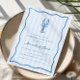 Our summery lobster bake rehearsal dinner invitation is perfect for your seaside celebration! Whimsical coastal design features Mediterranean blue lettering and illustrations on a pale blue cabana stripe background. A hand drawn lobster doodle sits atop your event details, framed by a wavy scallop border.