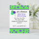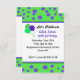 A fun birthday invitation with bright colours of green and blue. Three balloons accent the corner. The borders are green with blue dots. Customize with all of your birthday party information as desired.