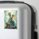 Dragon themed magnet. A whimsical dragon, rendered in a detailed watercolor illustration style, perches atop a moss-covered ancient stone ruin. Sunlight filters through the dense forest canopy, illuminating dust motes dancing in the air. The dragon's scales shimmer with iridescent hues, and its eyes hold a gentle, knowing, fun fantasy art. Cute for a boy's room.