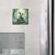 Dragon themed magnet. A whimsical dragon, rendered in a detailed watercolor illustration style, perches atop a moss-covered ancient stone ruin. Sunlight filters through the dense forest canopy, illuminating dust motes dancing in the air. The dragon's scales shimmer with iridescent hues, and its eyes hold a gentle, knowing, fun fantasy art. Cute for a boy's room.