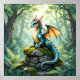 Dragon themed poster for boy's room. A whimsical dragon, rendered in a detailed watercolor illustration style, perches atop a moss-covered ancient stone ruin. Sunlight filters through the dense forest canopy, illuminating dust motes dancing in the air. The dragon's scales shimmer with iridescent hues, and its eyes hold a gentle, knowing, fun fantasy art. Cute for a boy's room.