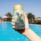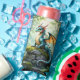 Dragon themed can cooler. A whimsical dragon, rendered in a detailed watercolor illustration style, perches atop a moss-covered ancient stone ruin. Sunlight filters through the dense forest canopy, illuminating dust motes dancing in the air. The dragon's scales shimmer with iridescent hues, and its eyes hold a gentle, knowing, fun fantasy art. Cute for a boy's room.