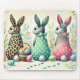 An enchanting Easter scene featuring a line of sitting bunnies, each adorned with a unique and vibrant design. The first bunny sports a chic leopard print, the second is decorated with playful pastel polka dots, and the third showcases a delicate floral pattern with its back facing the viewer. Tracks from the floral bunny lead to a charming Easter basket filled with brightly colored eggs. The background is a soft, spring-inspired palette of blooming flowers and greenery, creating a whimsical and festive atmosphere. Crafted with a smooth surface for effortless mouse movement and a non-slip rubber base for stability, it's as functional as it is delightful. Perfect for Easter gifting or personal use!