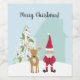 An elf and his reindeer standing in the snow with the saying "Merry Christmas"