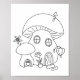 Whimsical fairy mushroom house with round doors and windows, Chinese lantern plant for a porch light, tiny windmill on a roof, and even a pantry inside a smaller mushroom. Made for easy colouring.