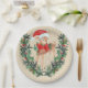 Festive holiday design features whimsical fawn and holly wreath on tan background.