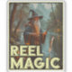 This whimsical image features a wizard standing by a river in a forested area, holding a fishing rod with a fish floating towards the line. Dressed in traditional wizard attire, including a long robe and a pointed hat, the wizard casts a magical spell while fishing. The background, with trees and mountains, creates a mystical and serene atmosphere. The text "REEL MAGIC" prominently displayed at the bottom of the image, adds a humourous and magical touch to the scene.