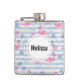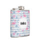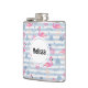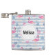 A flask with a pattern with a fun summery vibe. Pink flamingos and pineapples set on a light blue striped pattern with leaves and hearts all around.