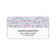 Address labels with a pattern with a fun summery vibe. Pink flamingos and pineapples set on a light blue striped pattern with leaves and hearts all around.