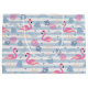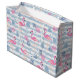 Gift bag with a pattern with a fun summery vibe. Pink flamingos and pineapples set on a light blue striped pattern with leaves and hearts all around.