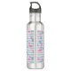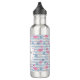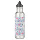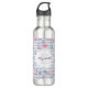 Water bottle with a pattern with a fun summery vibe. Pink flamingos and pineapples set on a light blue striped pattern with leaves and hearts all around.