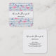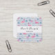 Business cards with a pattern with a fun summery vibe. Pink flamingos and pineapples set on a light blue striped pattern with leaves and hearts all around.