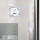 A birthday favour magnet with a pattern with a fun summery vibe. Pink flamingos and pineapples set on a light blue striped pattern with leaves and hearts all around.