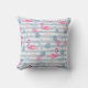 Pillow with a pattern with a fun summery vibe. Pink flamingos and pineapples set on a light blue striped pattern with leaves and hearts all around.