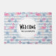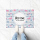 Welcome doormat with a pattern with a fun summery vibe. Pink flamingos and pineapples set on a light blue striped pattern with leaves and hearts all around.