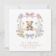 Announce your baby shower with a touch of playful elegance using this charming teddy bear themed invitation. The centerpiece is a delightful teddy bear adorned with a sweet blue bow, surrounded by a beautiful arrangement of pastel flowers and delicate greenery. The elegant script and soft color palette create a sophisticated yet heartwarming feel, perfect for celebrating mom to be's special day. This card is sure to set a joyful tone for your baby shower fun.