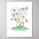 A vibrant drawing depicts a fantasy tree with colorful flowers and swirling branches. Two people stand at the base, one playing an instrument.