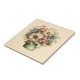 Ceramic tile with a cute image. Blue. pink and cream coloured flowers with green leaves. Set inside a green flower pot with a green plaid cloth hanging over the side.